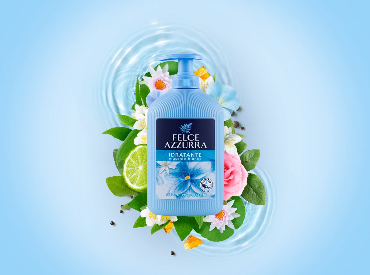最も代表的なフェルチェ・アズーラの香りは、58 種の花や植物から抽出した天然香料を原料としており、 この香料を製品の香りベースとして使用されています。