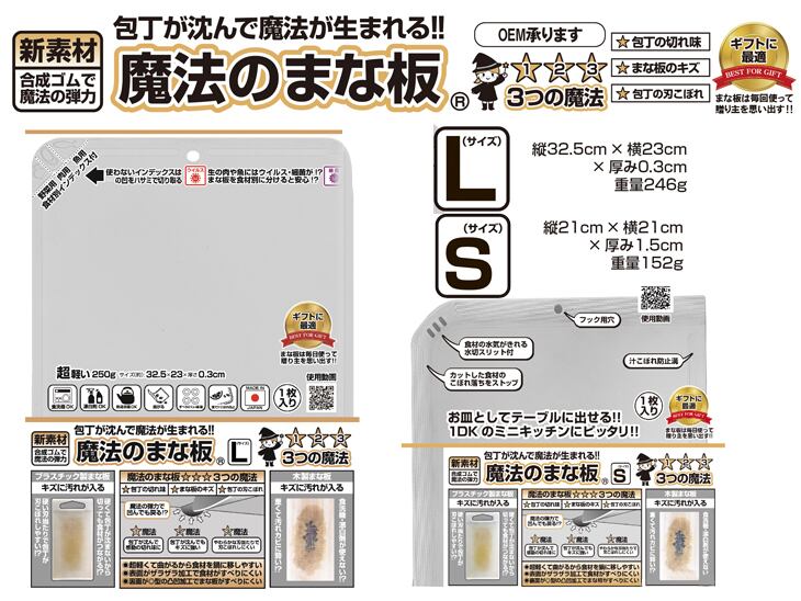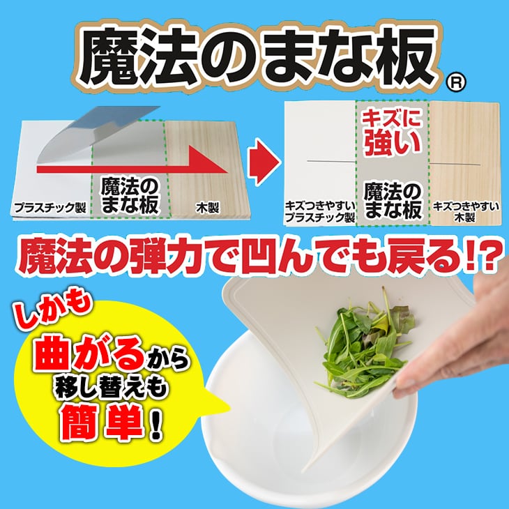 ※新素材合成ゴムの魔法の弾力で包丁が沈んで感動の切れ味に!包丁が沈んでもまな板がキズに強い!刃こぼれしにくい!