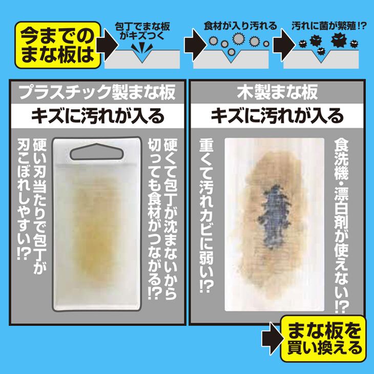 ・本製品は一般的なまな板に比べてキズがつきにくい素材ですが、包丁やナイフで強く切りつけたりするとキズがつきます。キズがつかないことを保証するものではありません。