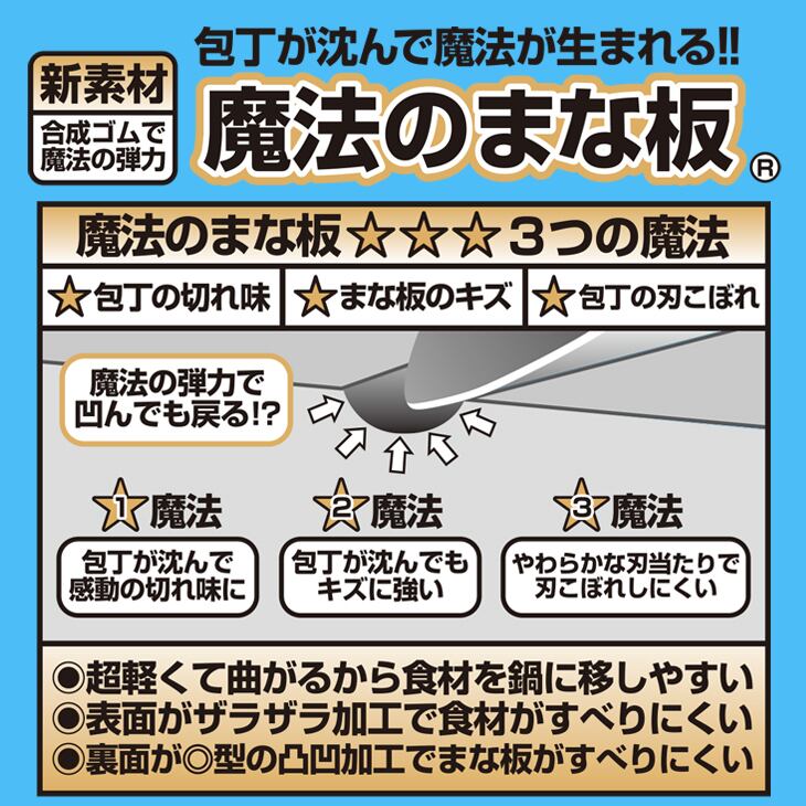 ※新素材合成ゴムの魔法の弾力で包丁が沈んで感動の切れ味に!包丁が沈んでもまな板がキズに強い!刃こぼれしにくい!